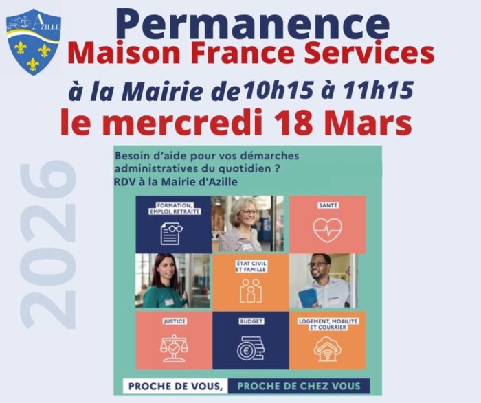 La prochaine permanence aura lieu à la mairie le mercredi 18 Mars de 10h15 à 11h15 à la Mairie d’Azille
