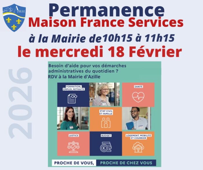 La prochaine permanence aura lieu à la mairie le mercredi 18 Février de 10h15 à 11h15 à la Mairie d’Azille